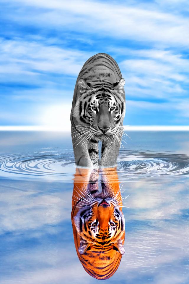 Wallpaper Tiger is reflected in the water against the blue sky