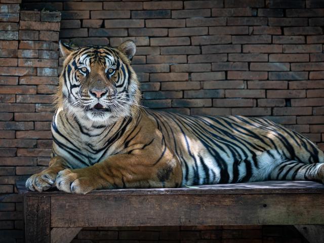 Wallpaper A large striped tiger lies on a wooden table in the zoo