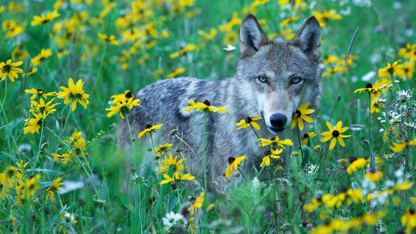Wallpaper Wolf among grass and yellow flowers