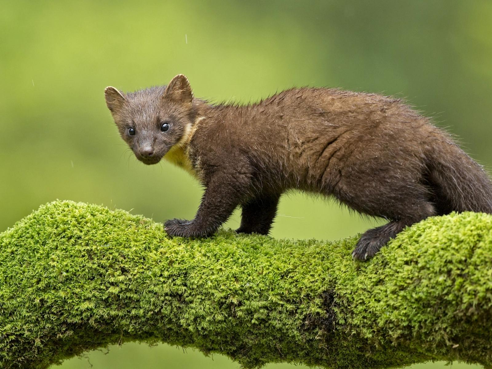 Wallpaper The marten stands on a moss-covered tree branch