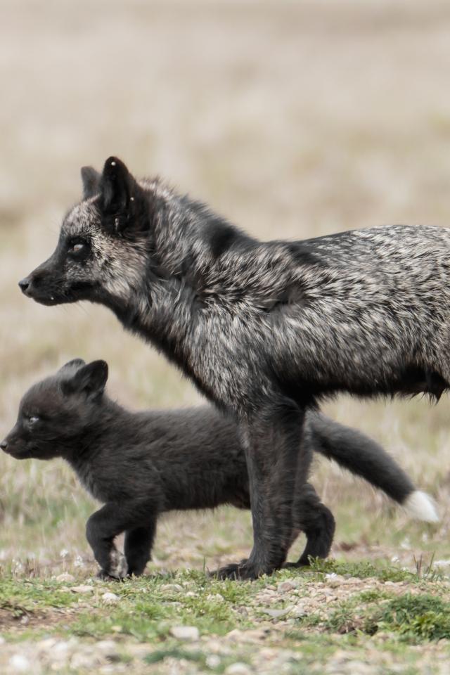 Wallpaper Black fox with small baby