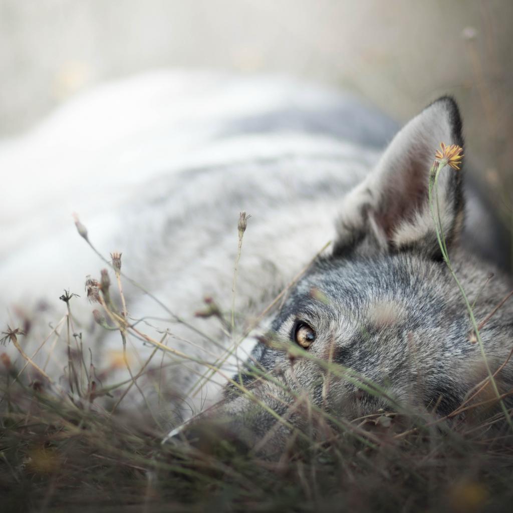 Wallpaper A sad gray wolf lies on a dry grass