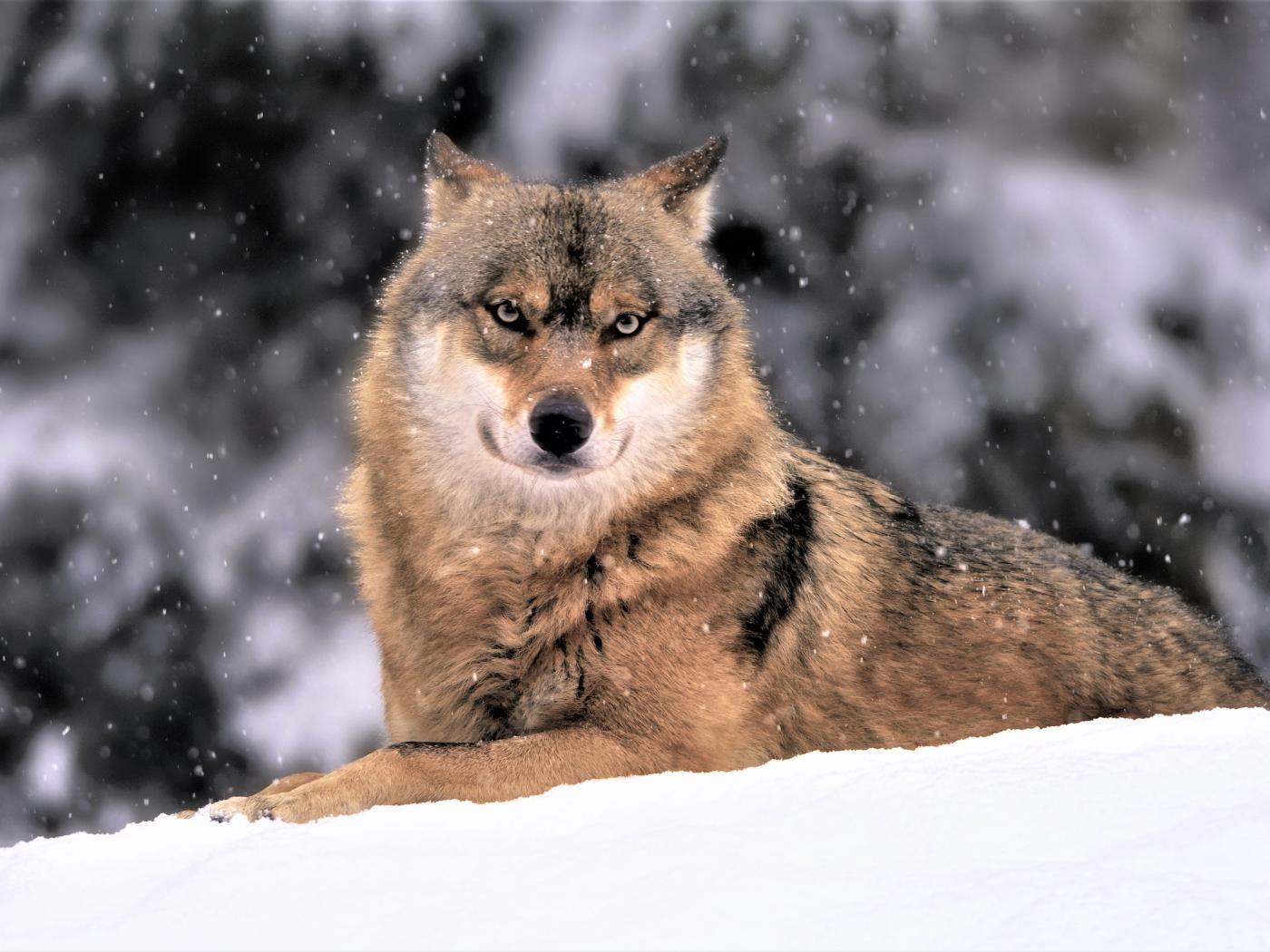 » Wallpaper The big wolf lies on white snow