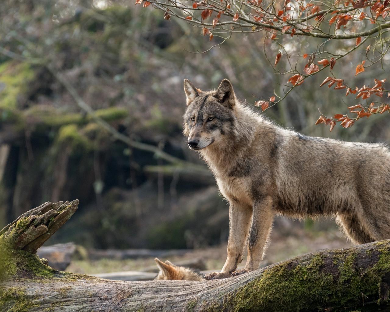 Wallpaper A gray she-wolf with a wolf stands on a mossy tree