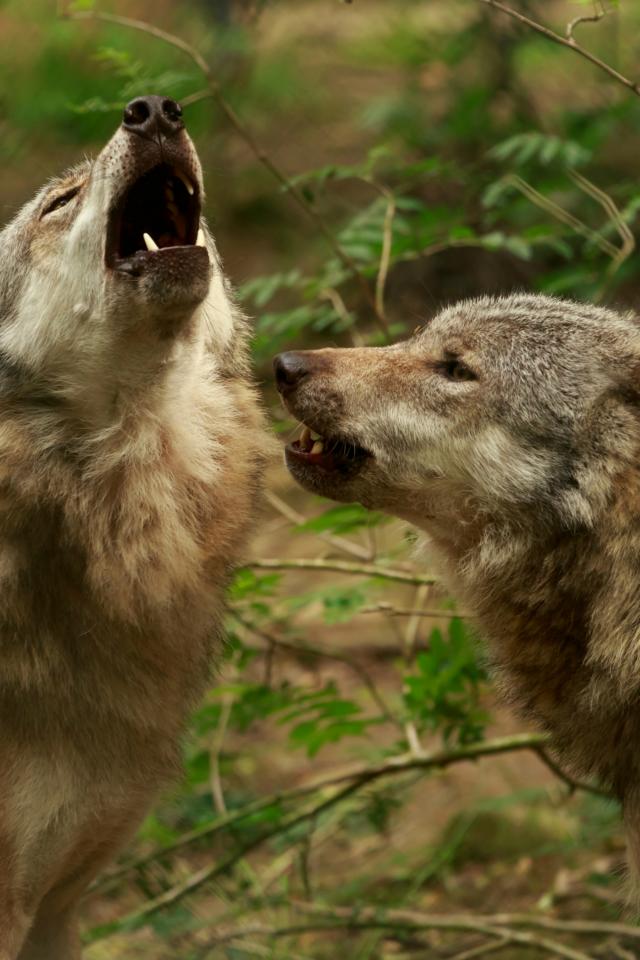 Wallpaper Two gray wolves howling in the forest