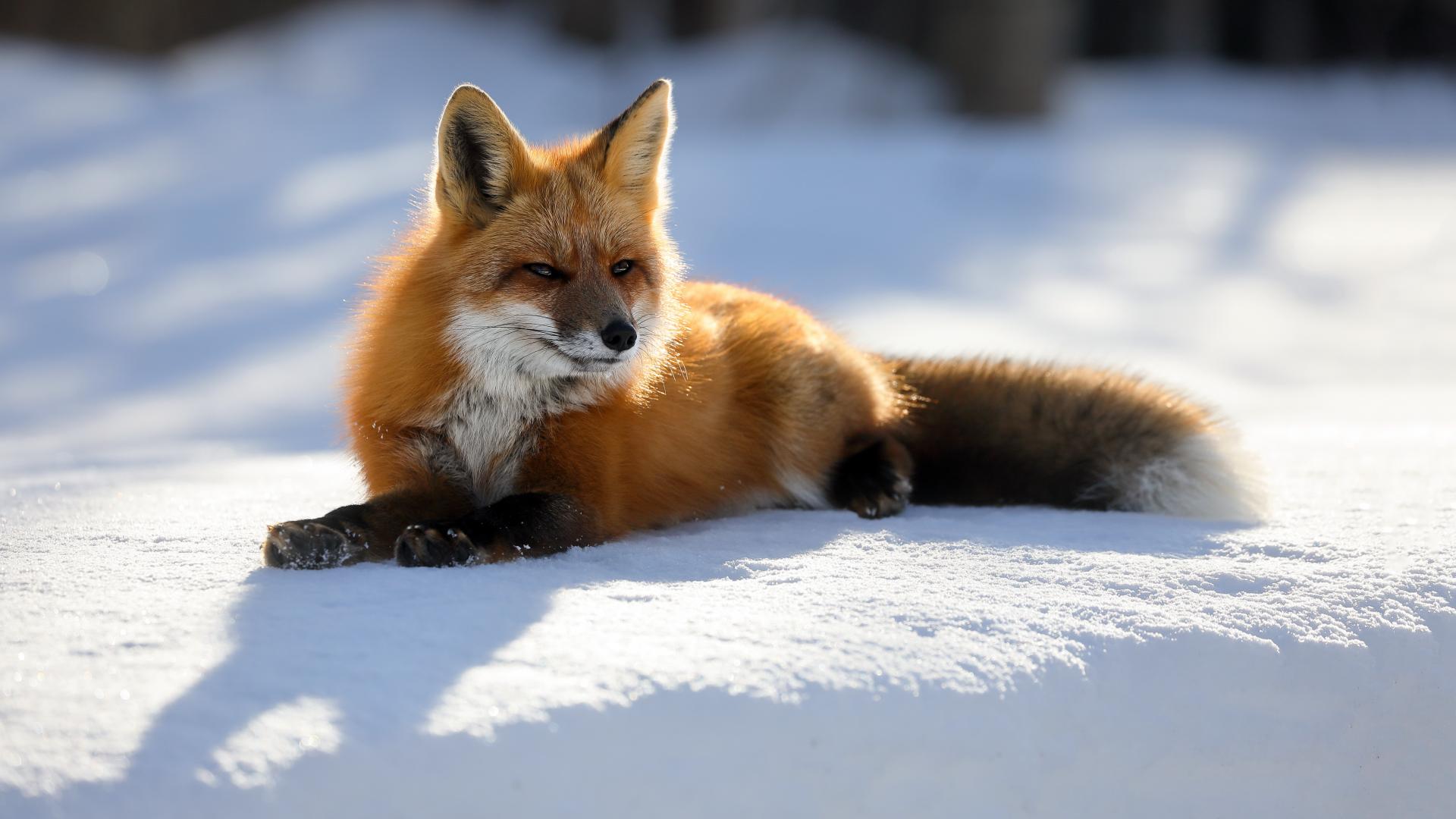 Wallpaper A cunning red fox lies on the snow