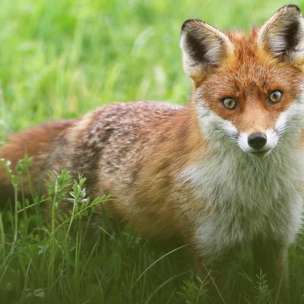 Wallpaper Sly fox stands in green grass