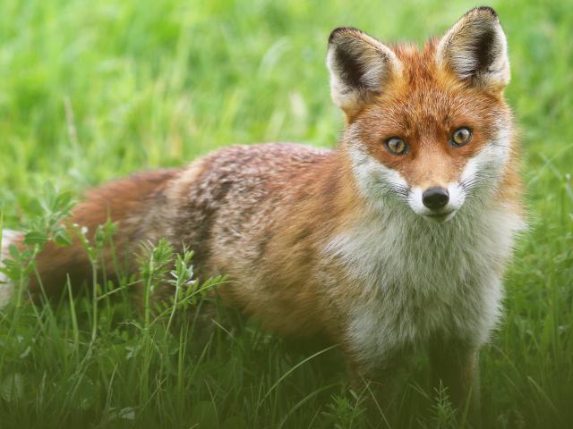 Wallpaper Sly fox stands in green grass