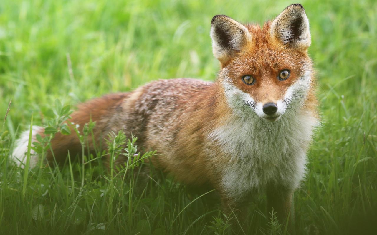 Wallpaper Sly fox stands in green grass