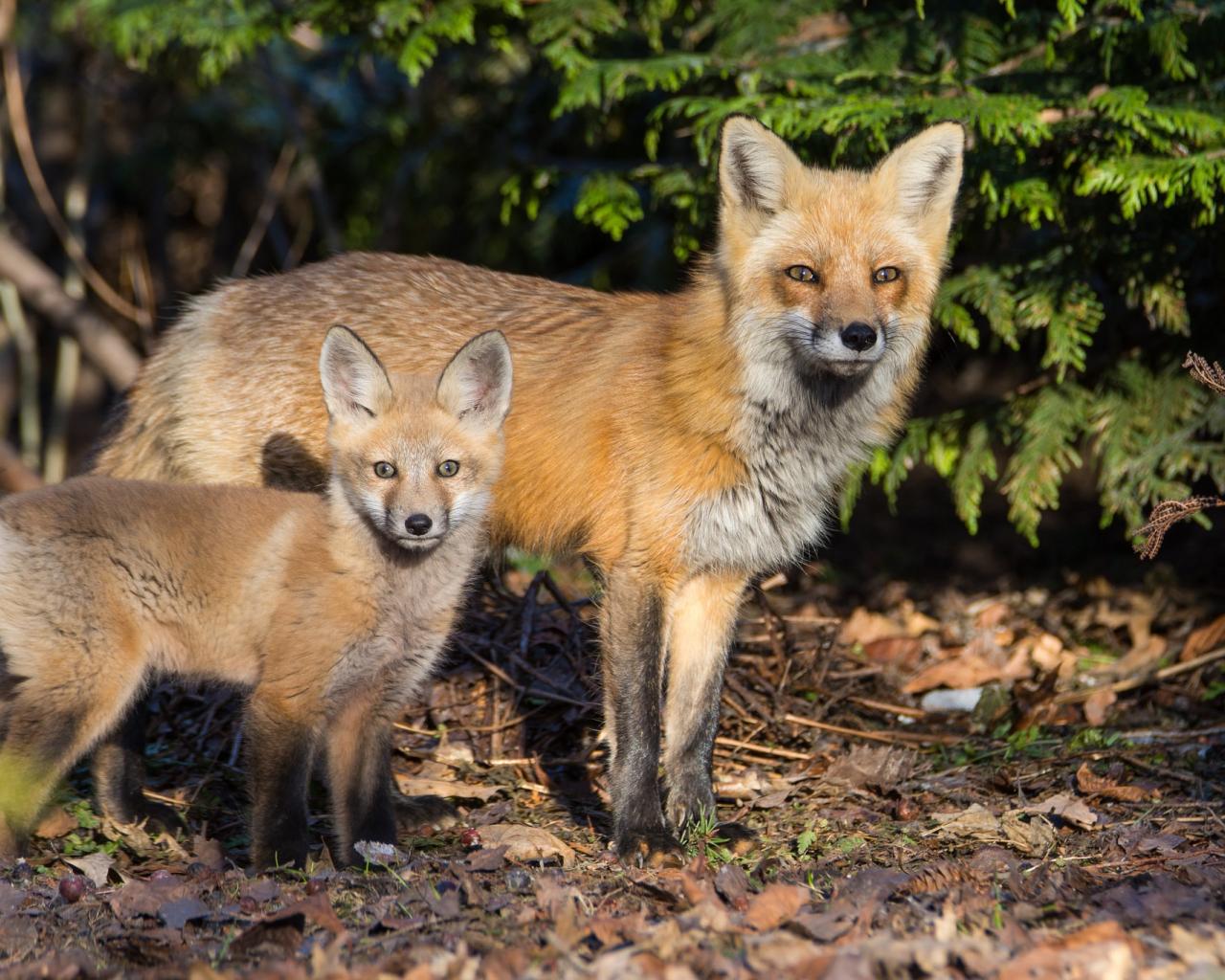 » Wallpaper Fox with a little fox in the forest