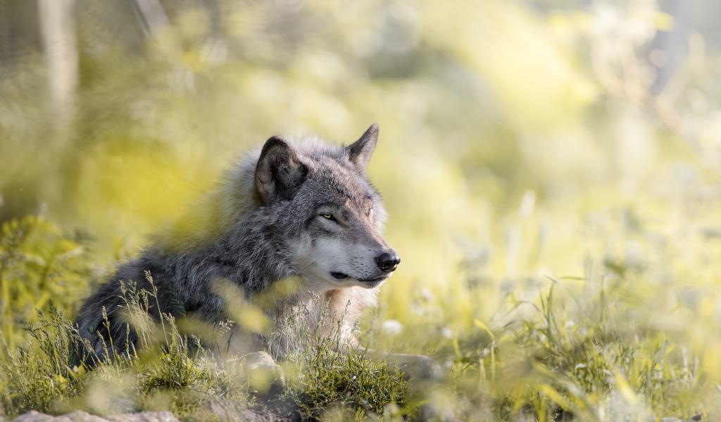 Wallpaper Serious gray wolf lying on the grass