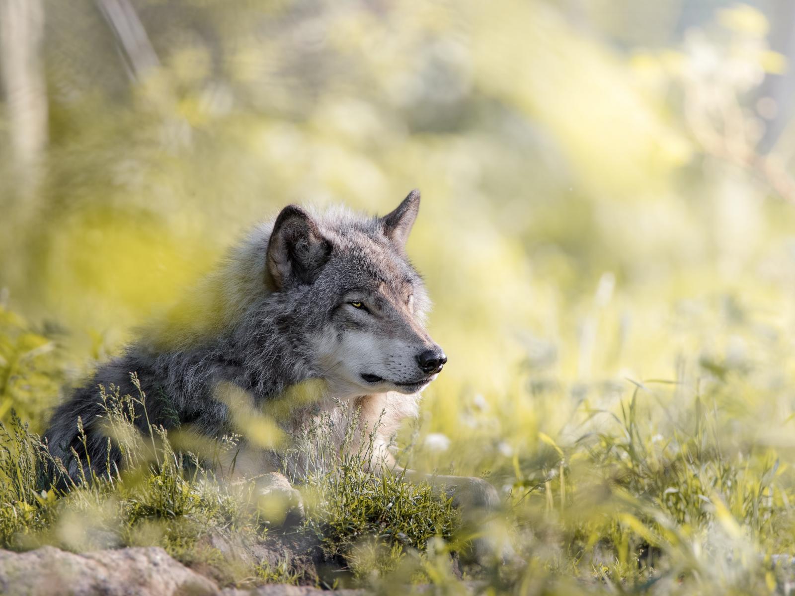 Wallpaper Serious gray wolf lying on the grass