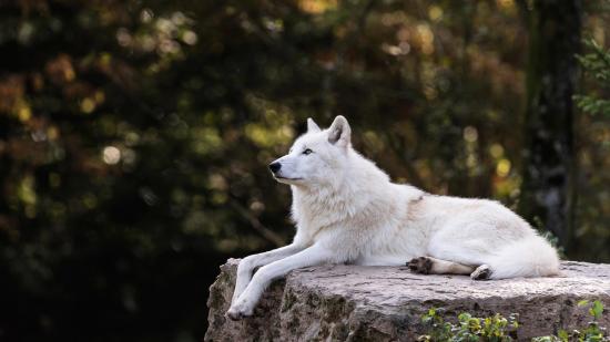 Wallpaper The big white wolf lies on a stone
