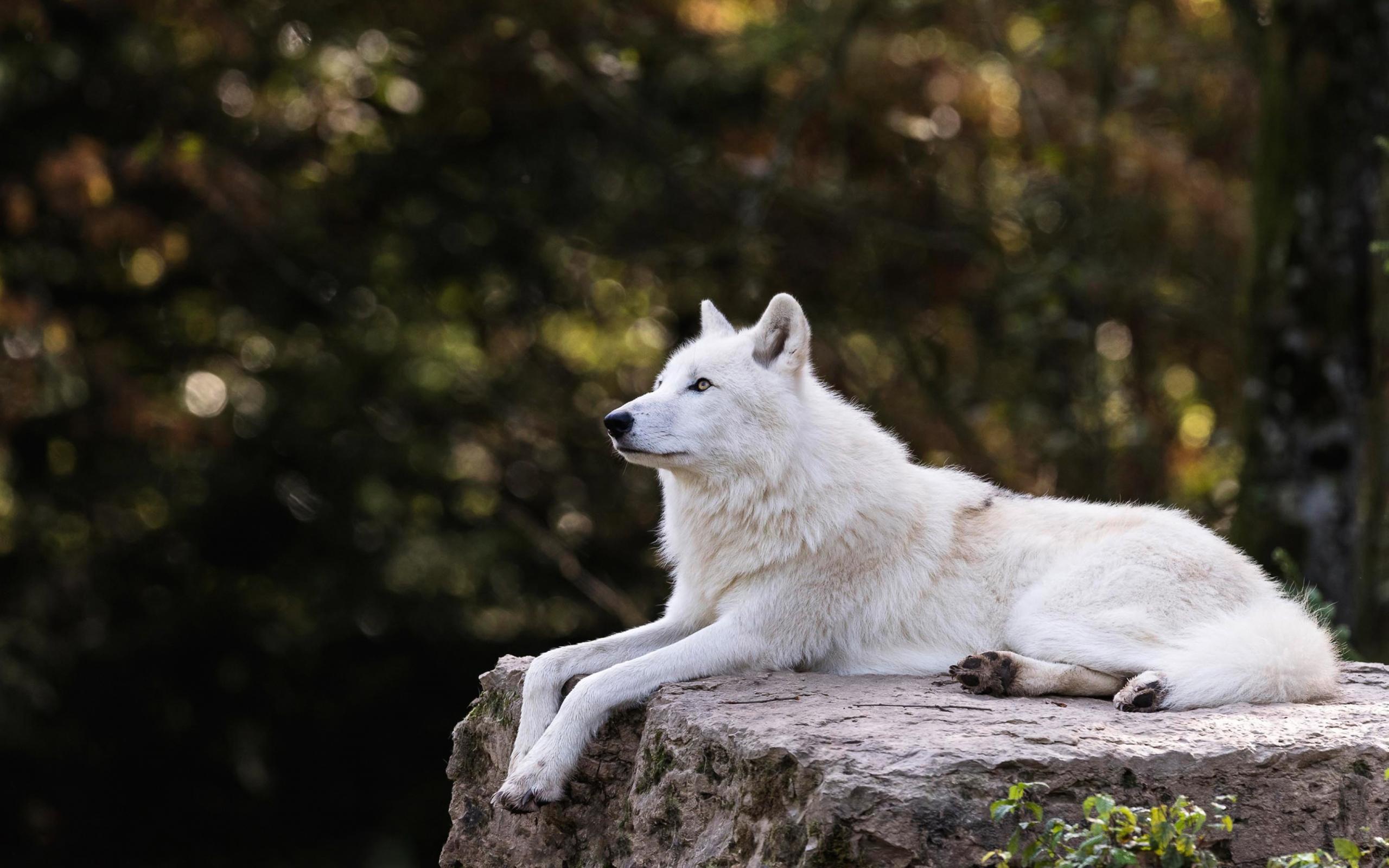 Wallpaper The big white wolf lies on a stone