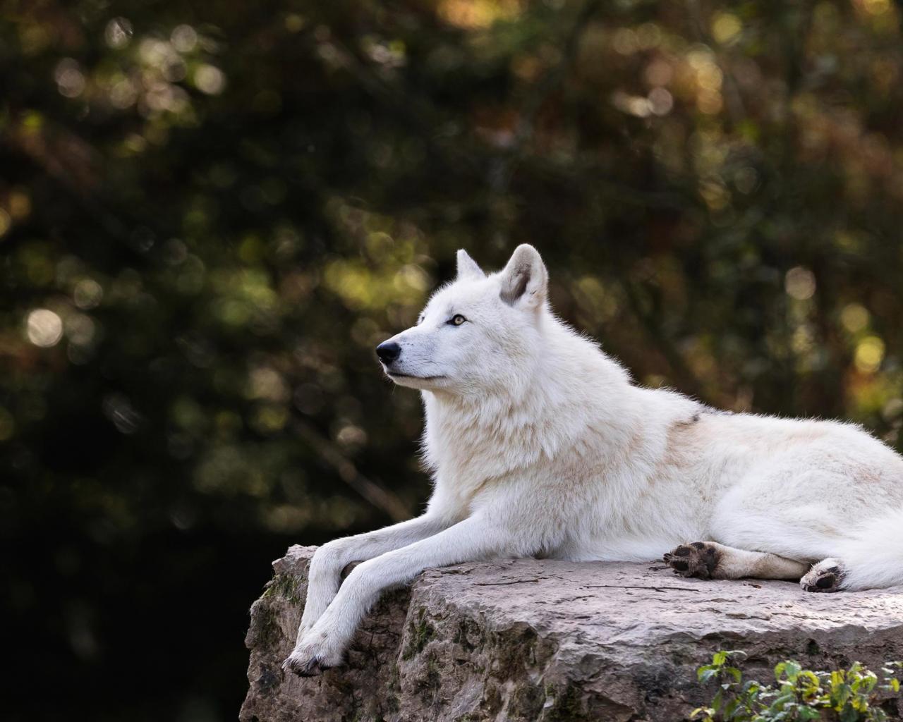 Wallpaper The big white wolf lies on a stone
