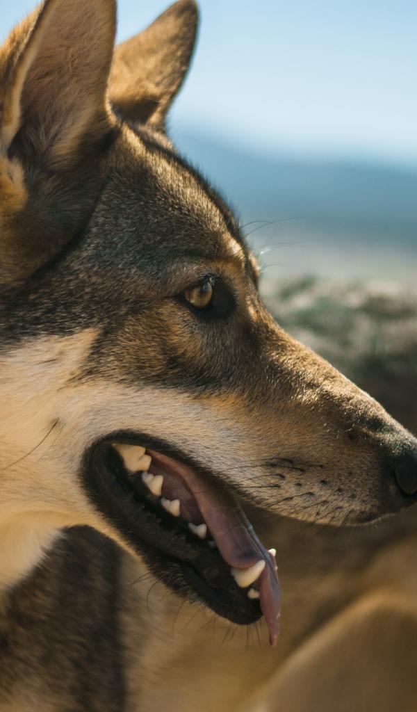 Wallpaper A dog with his tongue sticking out stands on the road with dry grass