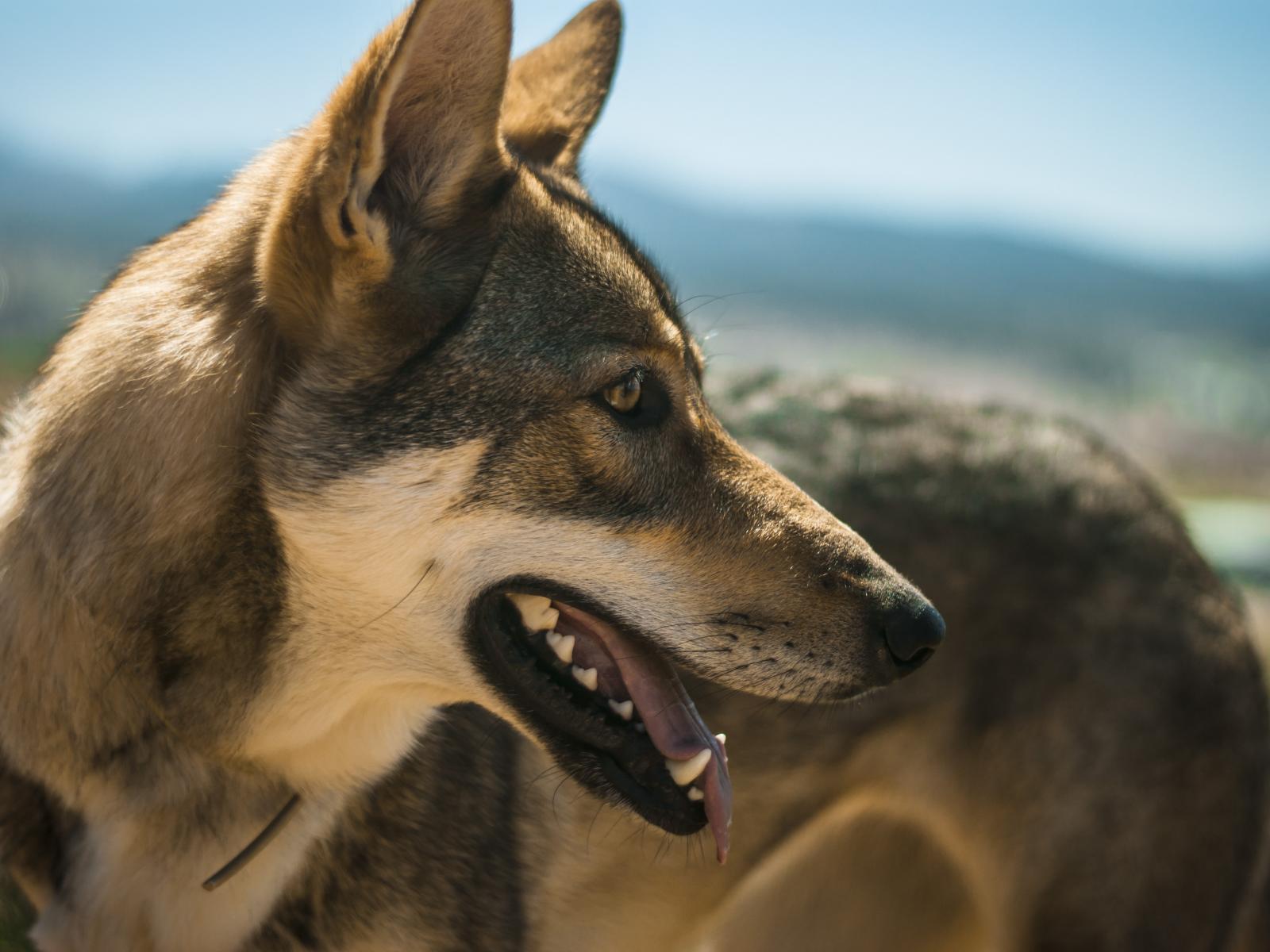Wallpaper A dog with his tongue sticking out stands on the road with dry grass