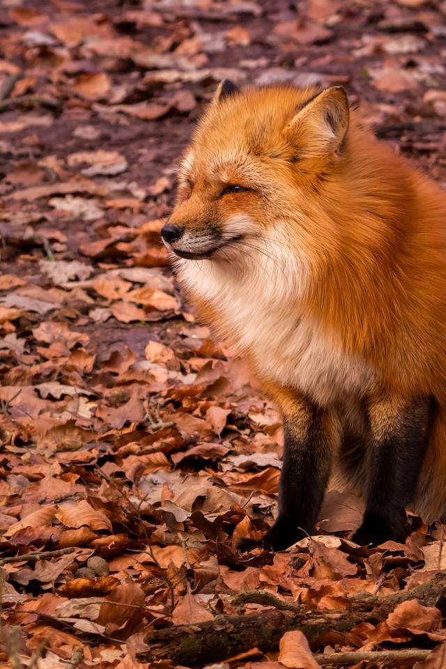 Wallpaper Content fox sits on dry fallen foliage