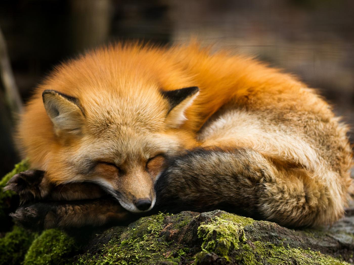 Wallpaper Big red fox sleeps on a stone