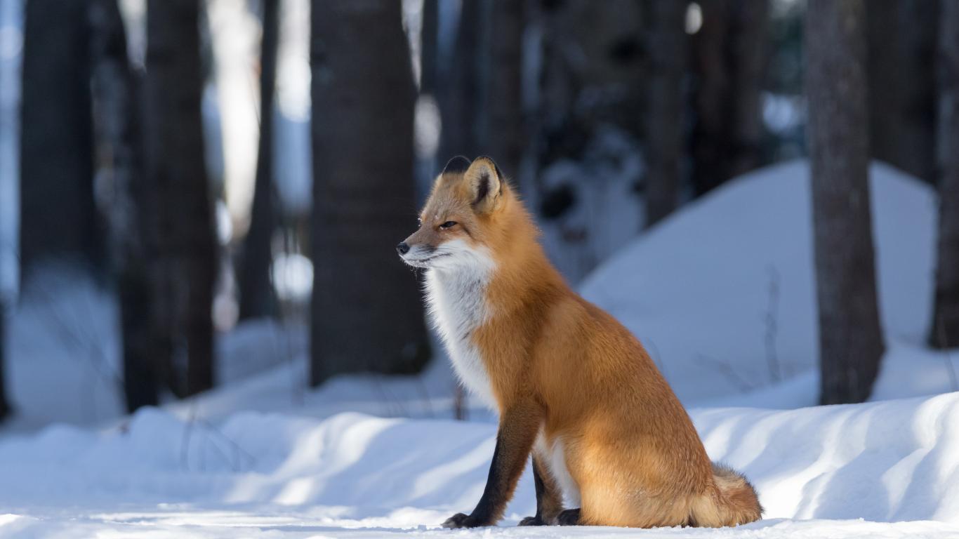 Wallpaper Sly red fox sits in the snow in the forest