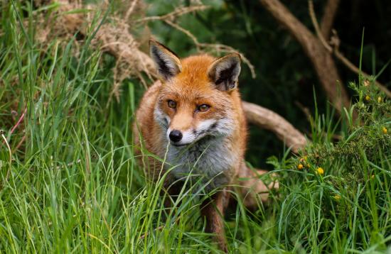 Wallpaper Big red fox hiding in the green grass.