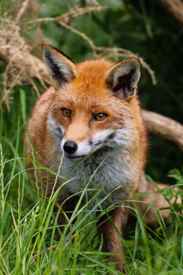 Wallpaper Big red fox hiding in the green grass.