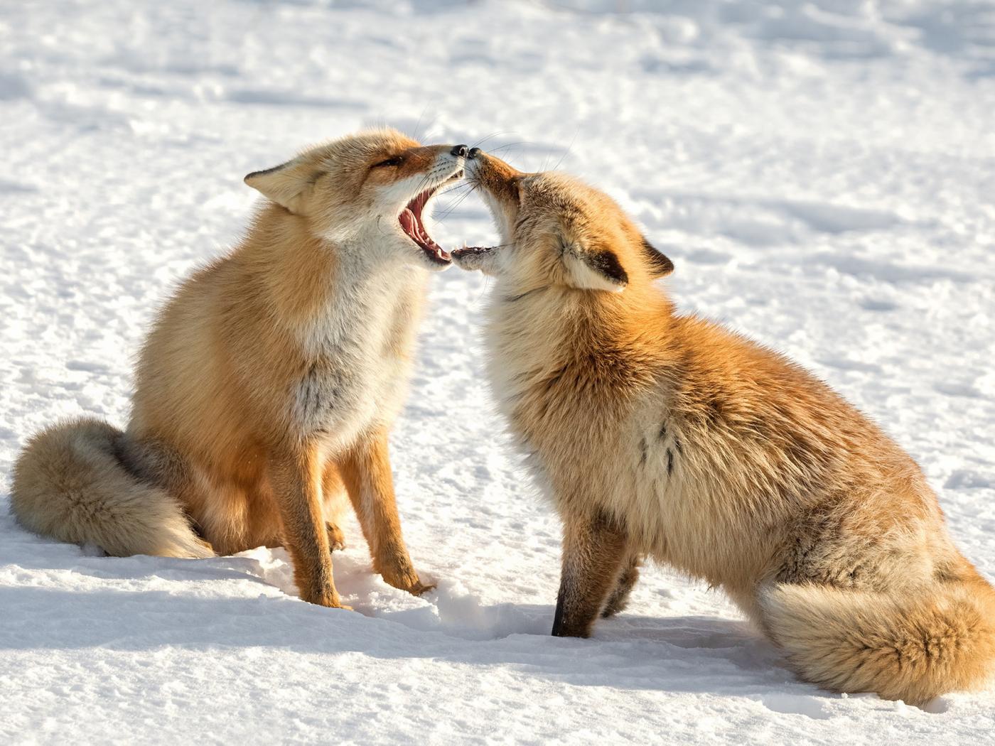 » Wallpaper Two cute red foxes in the snow