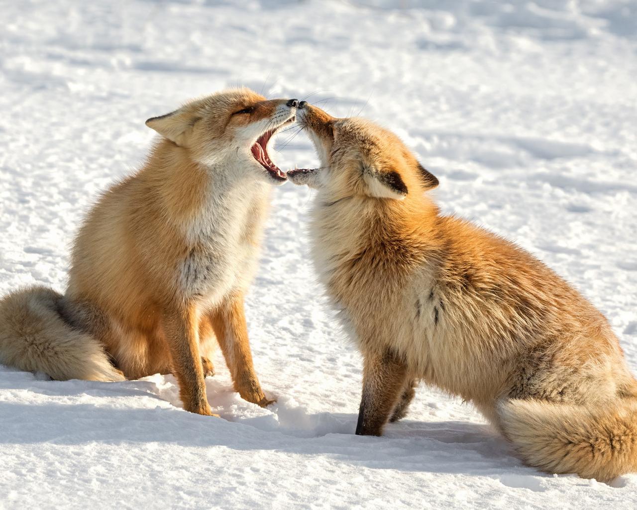 » Wallpaper Two cute red foxes in the snow