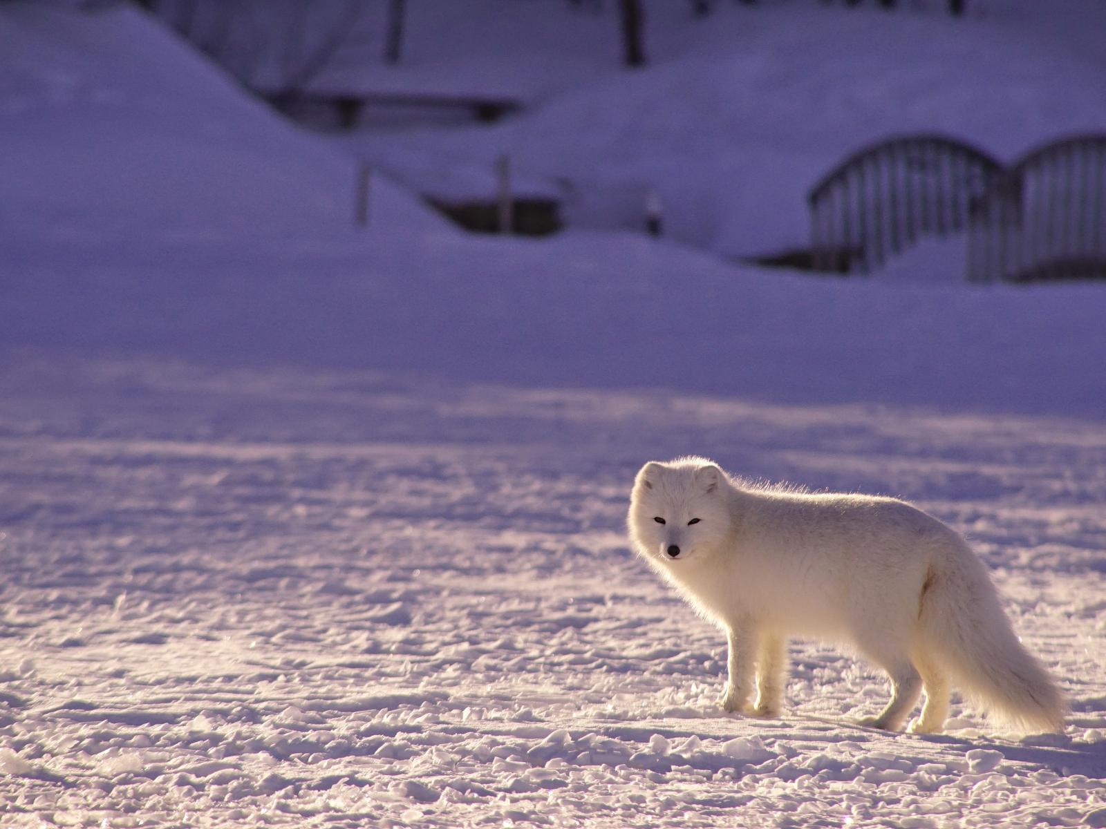Wallpaper White Arctic fox walks through the cold snow