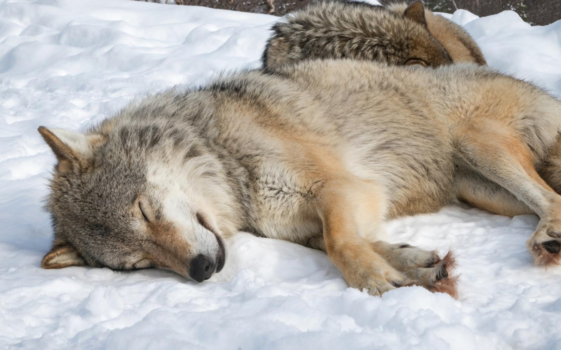 Wallpaper The big gray wolf sleeps in the cold snow