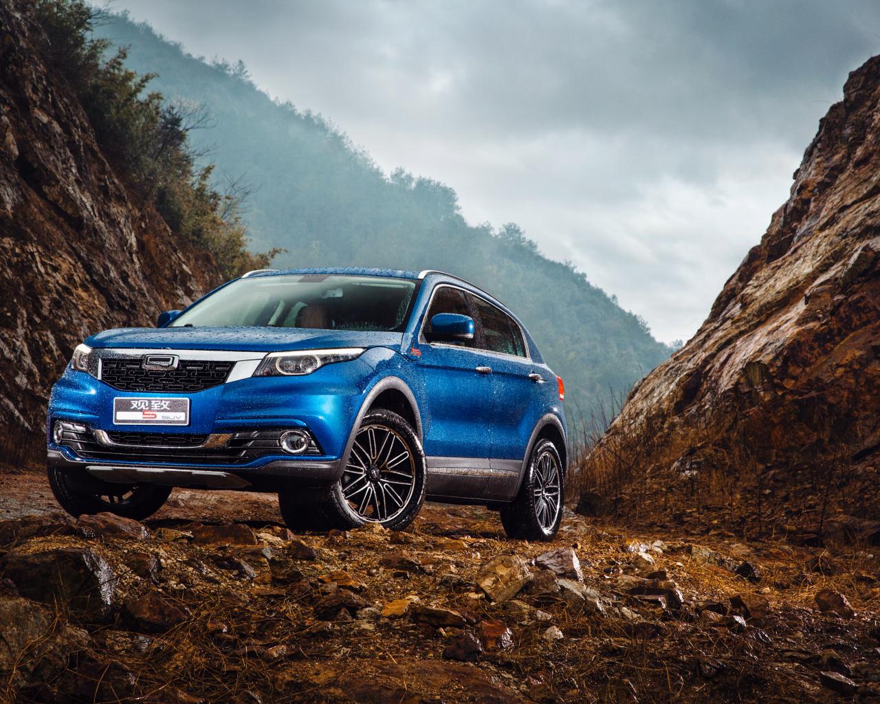 Wallpaper Blue Chinese car Qoros 5 under the rain