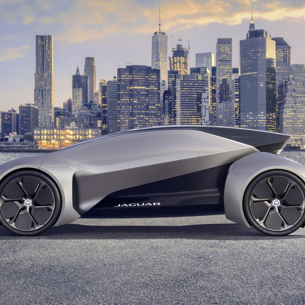 Wallpaper Silver electric car Jaguar Future-Type in the background of skyscrapers