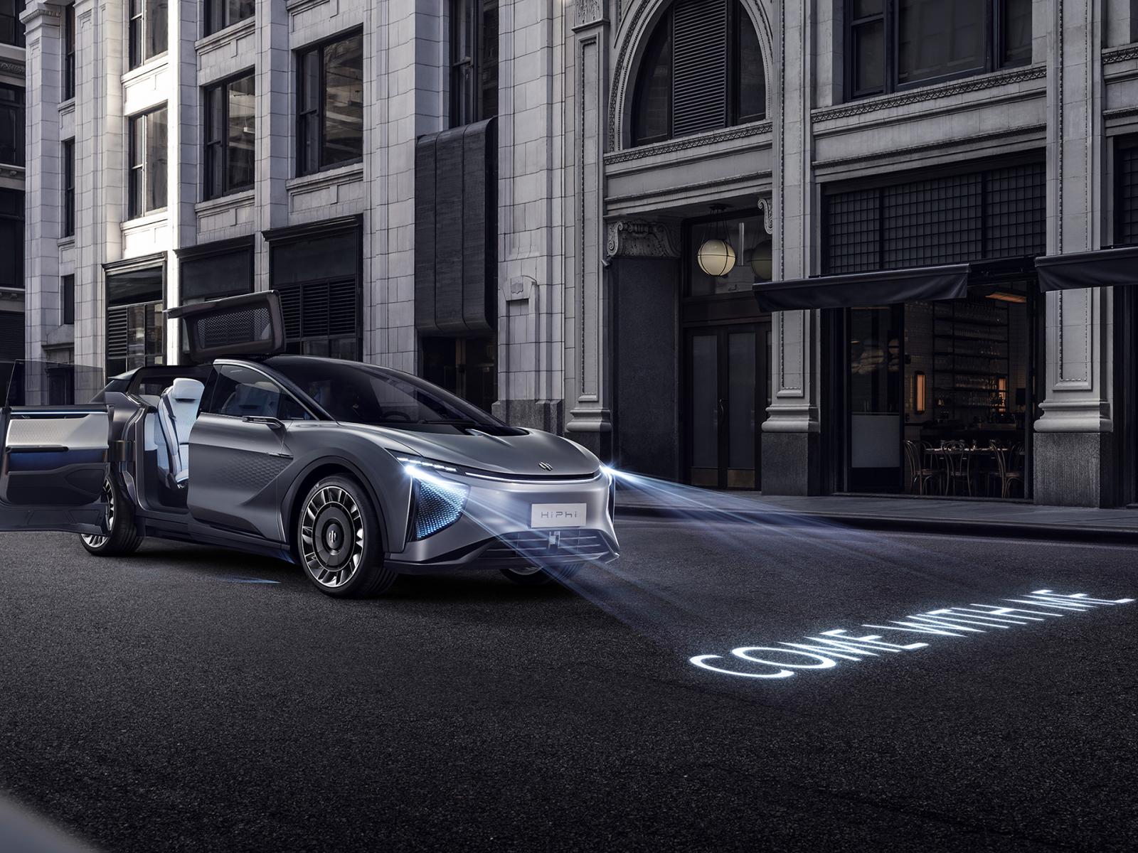 Wallpaper Silver electric crossover HiPhi 1, 2020 on a city street