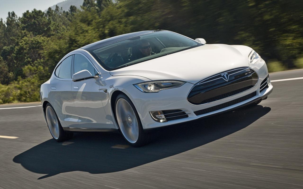 Wallpaper The snow-white Tesla electric car on the track