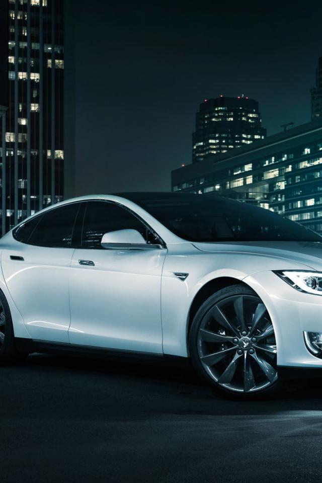 Wallpaper White Tesla electric car on the background of the city