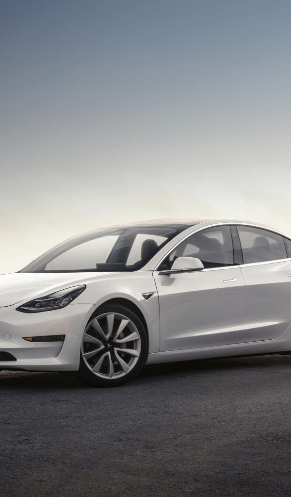 Wallpaper White electric vehicle Tesla Model 3, 2018 on the background of the horizon