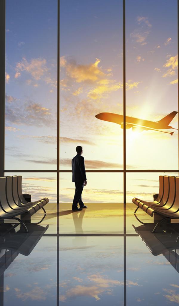 Wallpaper A man looks out the window at a plane taking off