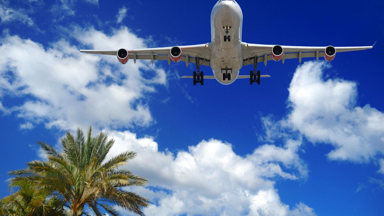 Wallpaper Embraer airliner flying over palm trees