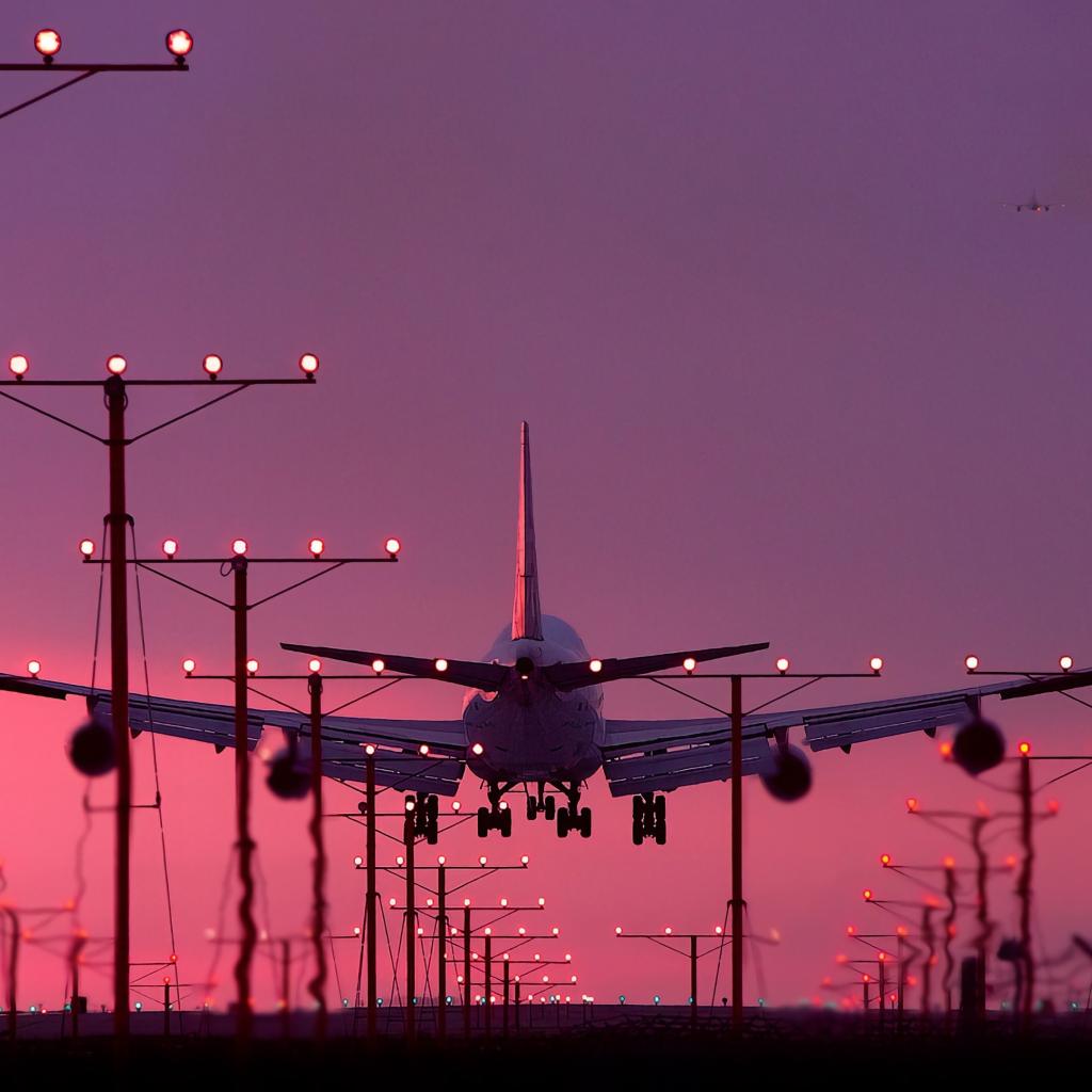 Wallpaper A passenger plane is landing at sunset