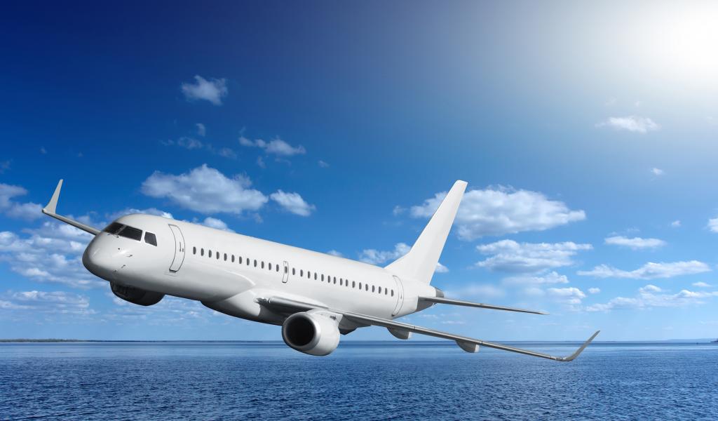 Wallpaper A large white passenger plane flies over the sea