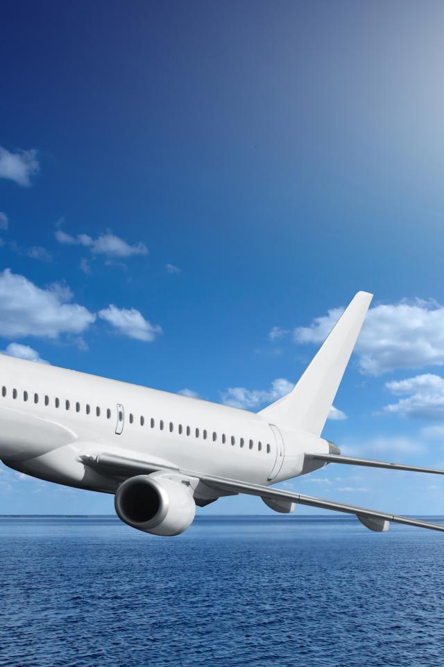 Wallpaper A large white passenger plane flies over the sea