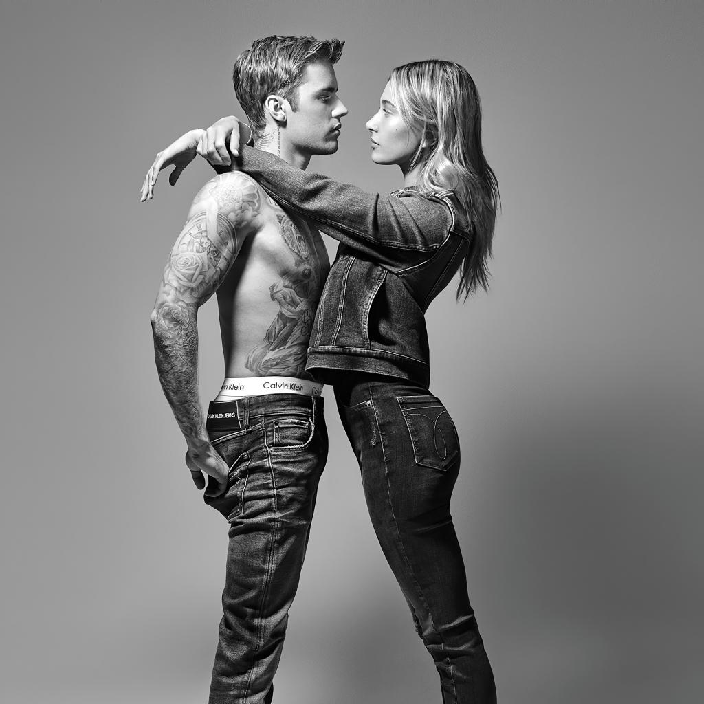 Wallpaper Model Hayley Baldwin and singer Justin Bieber on a gray background