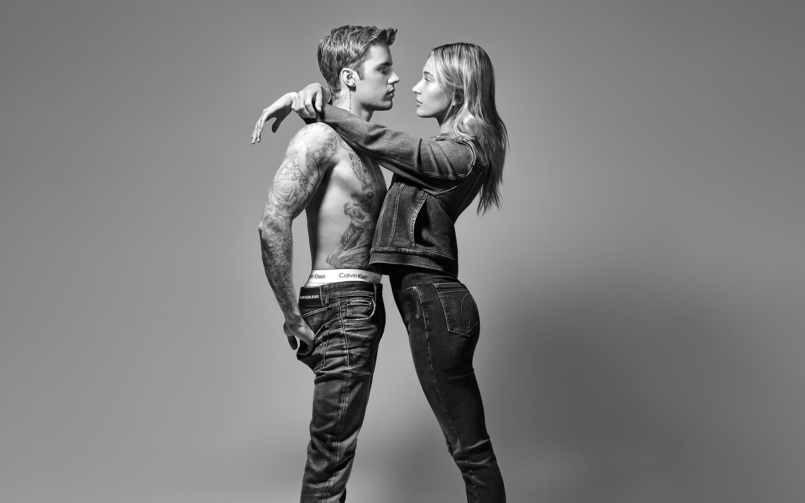 Wallpaper Model Hayley Baldwin and singer Justin Bieber on a gray background