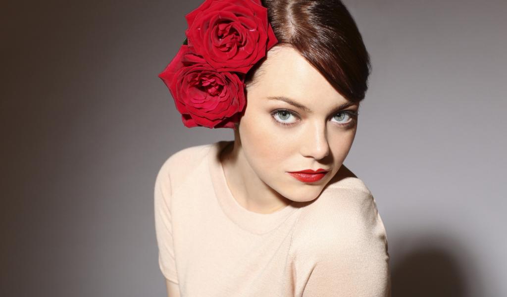 Wallpaper Actress Emma Stone with red roses in her hair