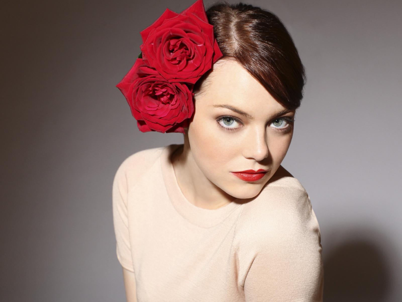 Wallpaper Actress Emma Stone with red roses in her hair