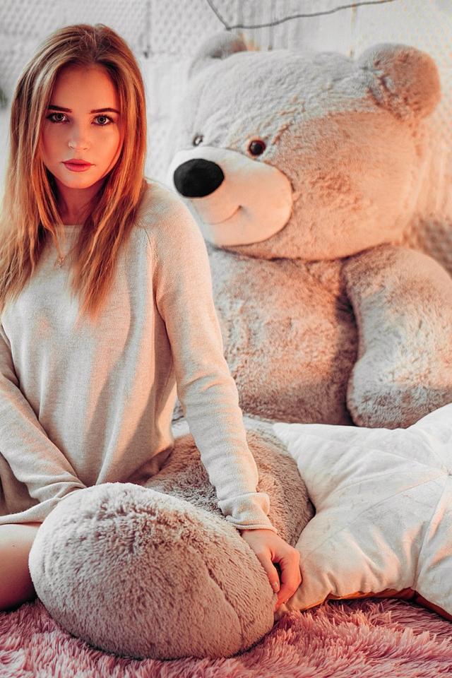 Wallpaper Girl actress Polina Grents with a big teddy bear