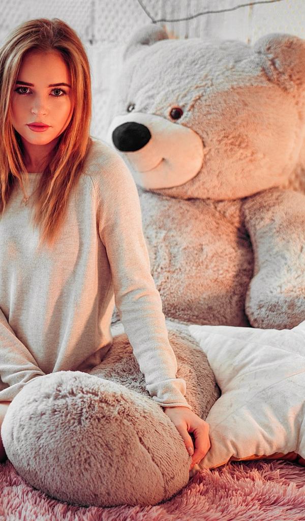 Wallpaper Girl actress Polina Grents with a big teddy bear