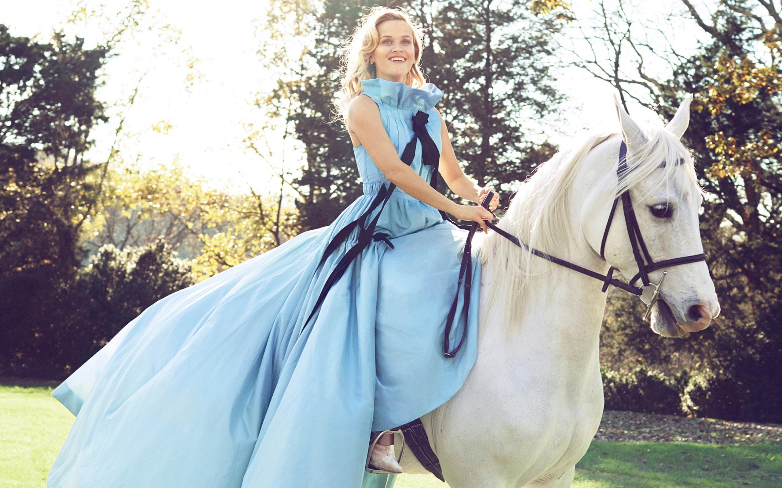 Wallpaper Beautiful actress Reese Witherspoon on a white horse