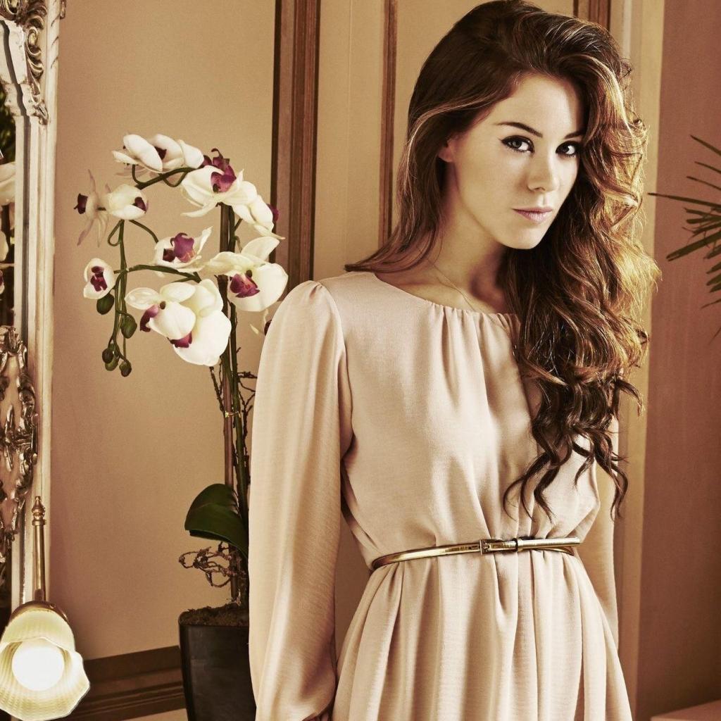 Wallpaper Brunette actress Roxanne Mackey stands next to an orchid flower