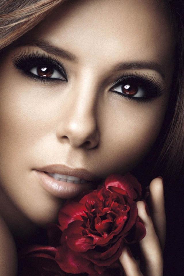 Wallpaper Beautiful brown-eyed actress Eva Longoria with a red flower